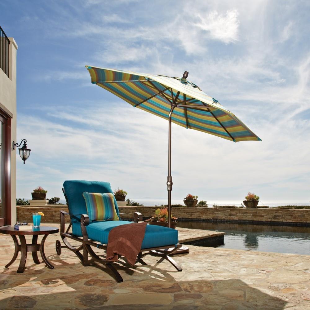 The easy twist collar tilt function allows you to adjust the angle of the umbrella to your liking, providing optimal shade coverage wherever you need it. Constructed with a durable powder-coated aluminum frame, this umbrella is available in either a sleek black or bronze finish that will complement any outdoor decor. The textured two-piece ribbed pole adds an extra touch of style and sophistication, while providing 57sq. ft. of shade coverage.